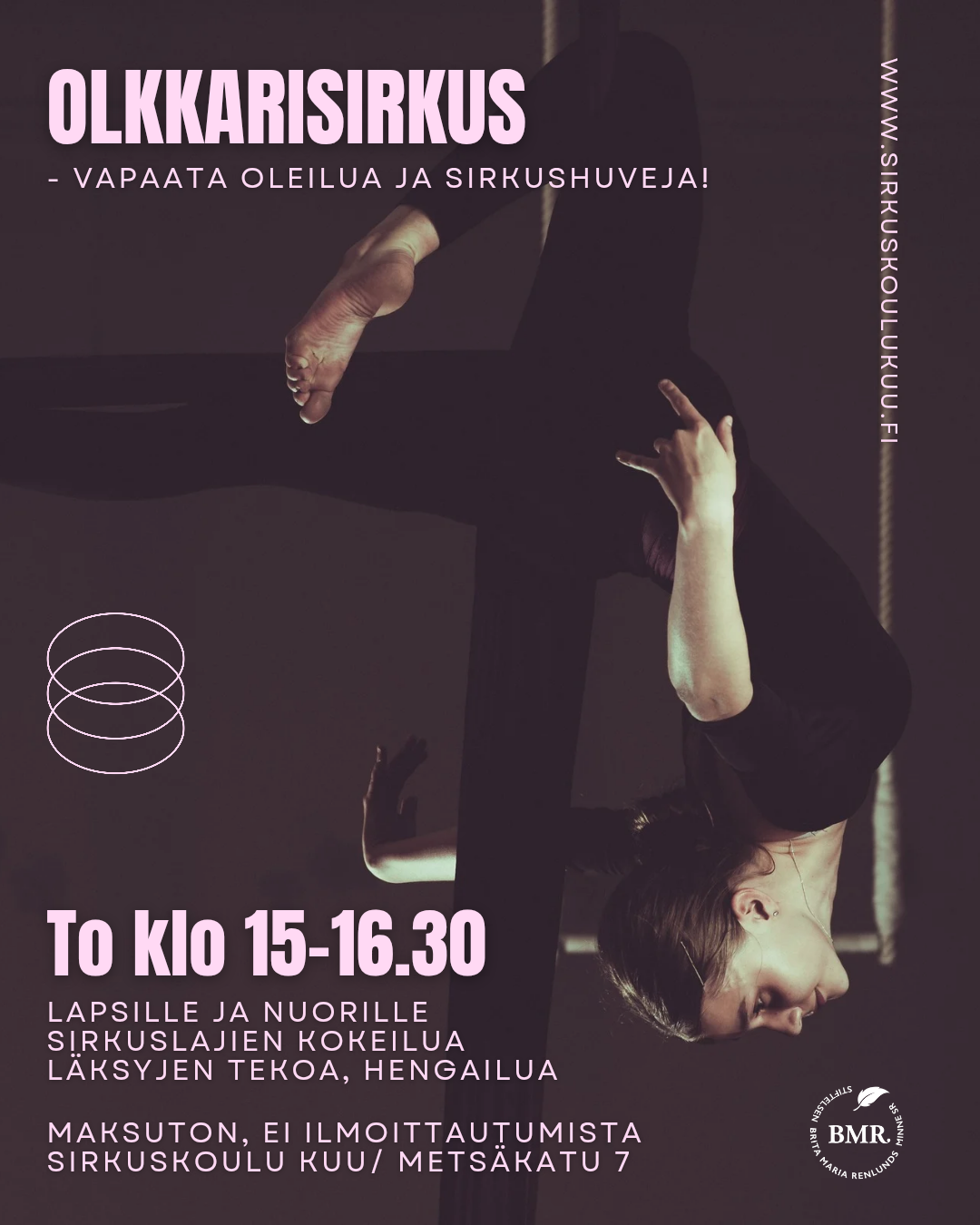 HUOM! Laitathan päälle VETOKETJUTTOMAT, liikkumiseen sopivat vaatteet ja otat terävät korut pois (Esim. vertikaalikankaisiin ei voi mennä vetoketjullisilla vaatteilla!)