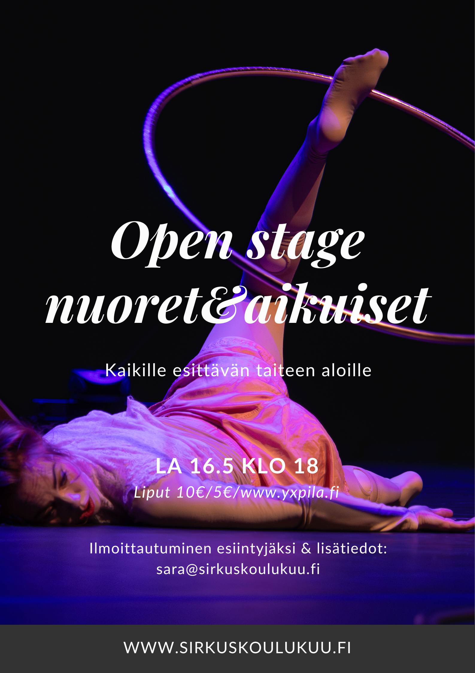 Sirkuskoulu Kuu järjestää nuorten ja aikuisten Open Stage-illan lauantaina 16.5 klo 18.